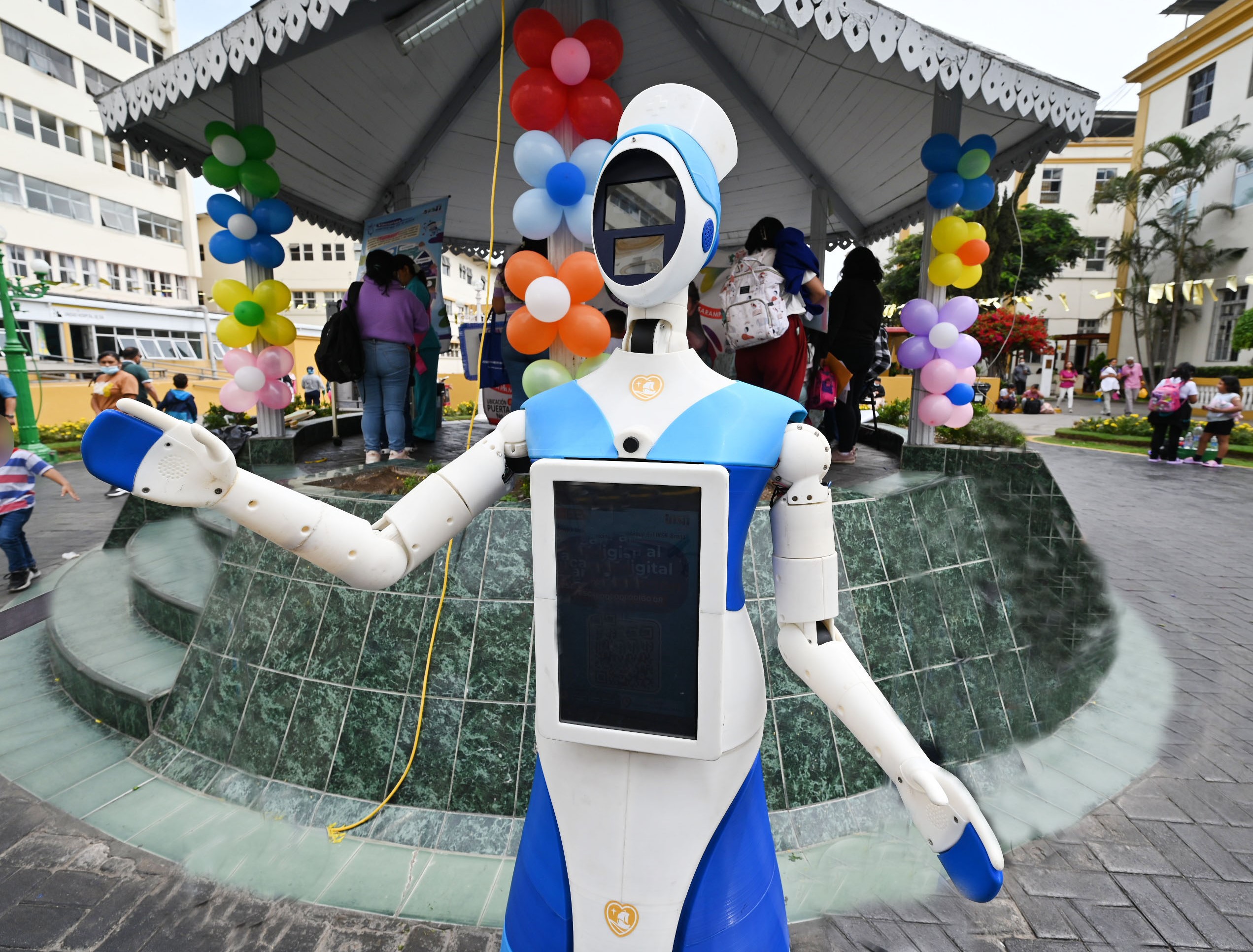 La presentación de la robot enfermera ocurrió durante el colorido pasacalle en el patio central del INSN Breña donde participó el director general, Dr. Carlos Urbano Durand, junto a niños de la cuna jardín y personal de salud. Se sumó el show de la Dirección de Tránsito, Transporte y Seguridad Vial de la Policía Nacional del Perú y la presencia de Batman y Spiderman como los Héroes Solidarios.