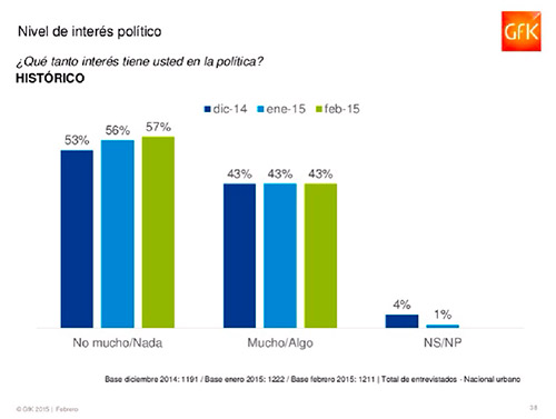 ¿No me cree? La encuestadora GFK realizó una encuesta para conocer el interés de los peruanos en la política, y como podrán ver en el siguiente cuadro, lo que está ocurriendo es que cada año a los peruanos nos importa menos.
