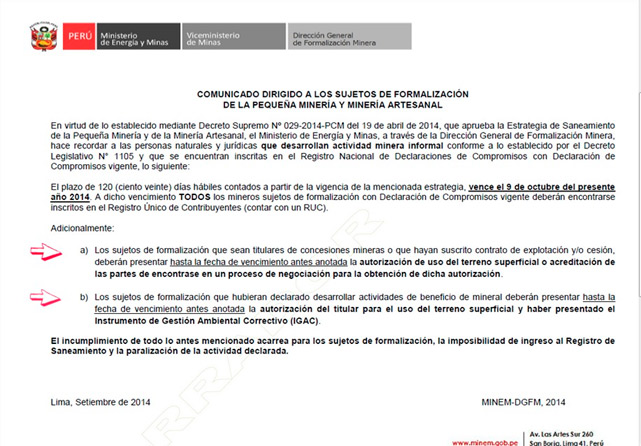 Sostenemos entonces que los conflictos sociales respecto de los mineros artesanales informales u ilegales en su gran mayoría reside en la imposibilidad de éstos de poder obtener el acuerdo contractual o convenio con el poseedor o titular de la superficie del terreno y así también con el titular de la concesión minera de ser el caso, así como el cumplimiento de aspectos medio ambientales por desconocimiento de la tecnología existente. Por ello prefieren mantenerse en la situación actual hasta que éstos puedan cumplir con las exigencias de la formalización y sentir sus beneficios. Tal es así que el Ministerio de Energía y Minas, en septiembre del año pasado expido un comunicado que nos da un indicador válido de las dificultades a las cuales están sometidos aquellos mineros artesanales que han optado por formalizarse y que aún no cumplen con los requisitos solicitados, el cual copiamos a continuación[ix]: