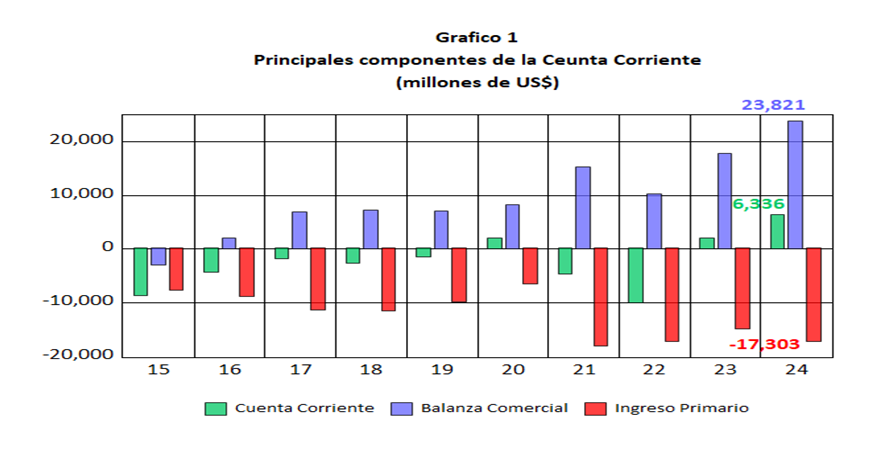 El Profesor Baca presenta, un gráfico que adjuntamos, que muestra la evolución de la cuenta corriente junto con los resultados de la balanza comercial y del Ingreso Primario para el periodo 2015 – 2024. Y aquí advierte el analista algo sumamente importante, que los extraordinarios resultados de la balanza comercial en los últimos cuatro años, producto de los favorables términos de intercambio y el estancamiento de las importaciones, se han visto opacados por la masiva salida de capitales reflejados en los Ingresos Primarios.