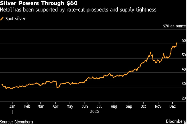El precio de la plata alcanzó los 63,86 dólares por onza, casi el doble de su nivel de hace un año, después de que la Reserva Federal recortara los tipos en 25 puntos básicos.