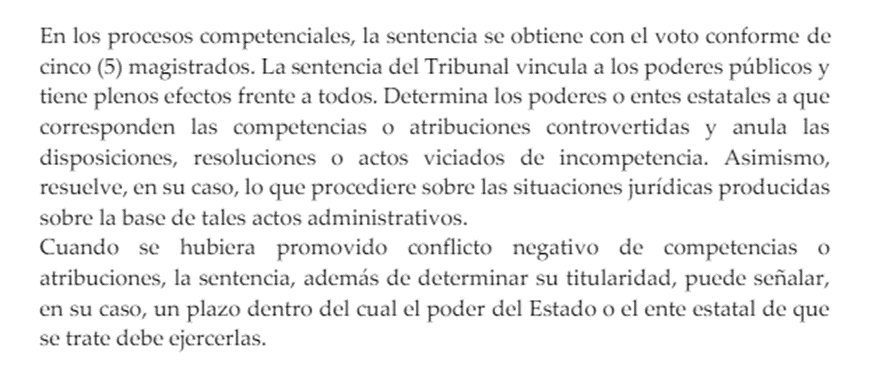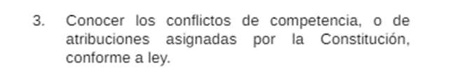 Según la Constitución el TC es el garante de la vigencia efectiva de los derechos fundamentales, guardián de la constitucionalidad de las normas con rango de ley, arbitro supremo de las competencias y supremo interprete de la Constitución. El TC es el máximo órgano de la justicia constitucional en el Perú. Así, el TC ejerce entre sus competencias resolver los conflictos competenciales entre poderes del Estado.