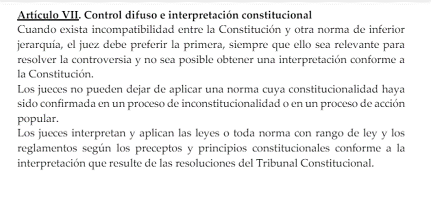 Por otro lado, el Artículo VII del Título Preliminar del NCPC señala que los jueces interpretan y aplican las leyes o toda norma con rango de ley y los reglamentos según los preceptos y principios constitucionales conforme a la interpretación que resulte de las resoluciones del Tribunal Constitucional.