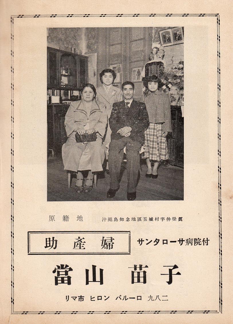 Comparto la foto de Naeko Toyama, una de las sanbasan más conocidas en Lima, que como dice en esta foto, trabajó en el Hospital Santa Rosa. (Foto tomada de: Libro Conmemorativo por el 5to Aniversario de la Asociación “Peru Okinawa Ongaku Kyoukai”. Lima. 1954).