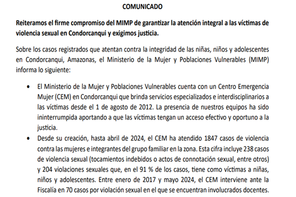 Sobre los casos registrados que atentan contra la integridad de las niñas, niños y adolescentes en Condorcanqui, Amazonas, el Ministerio de la Mujer y Poblaciones Vulnerables (MIMP) informa lo siguiente: