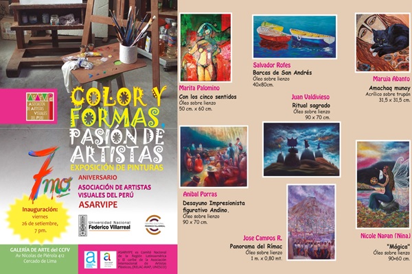 La Asociación de Artistas Visuales del Perú – ASARVIPE, en el marco de su séptimo aniversario, presenta la exposición colectiva “Color y formas, pasión de artistas”, que se inaugurará el viernes 26 de setiembre a las 7:00 p.m. en la Galería de Arte del Centro Cultural Federico Villarreal (Av. Nicolás de Piérola 412, Cercado de Lima).