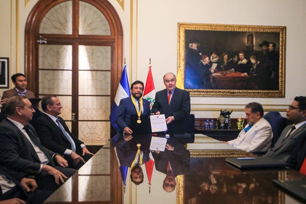 El alcalde de Lima, Ing. Rafael López Aliaga, entregó la Medalla de Lima y el diploma de Huésped Distinguido al Dr. Félix Augusto Antonio Ulloa Garay (hijo), actual vicepresidente de la República de El Salvador, en reconocimiento a su destacada trayectoria académica, política y social a nivel internacional.