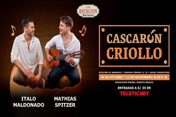 Cascarón Criollo es un espectáculo que celebra lo mejor de la canción criolla: clásicos de nuestro repertorio interpretados con humor, pasión y un guiño contemporáneo por los actores y cantantes Mathias Spitzer e Italo Maldonado. Acompañados por músicos en vivo, estos dos artistas (y pichones de la música criolla) se lanzan a redescubrir nuestro repertorio criollo con la energía de quienes lo heredan y la irreverencia de quienes se niegan a dejarlo morir.